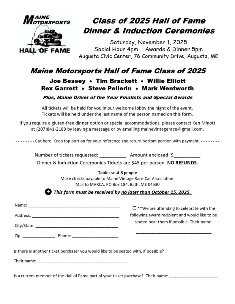 Tickets are now on sale for the 2025 Maine Motorsports Hall of Fame banquet. This year we are honoring 6 individuals who have had a significant and lasting impact on the history of Maine motorsports. The banquet will be held Saturday, November 1st at the Augusta Civic Center. Seating is limited, so get your tickets now.